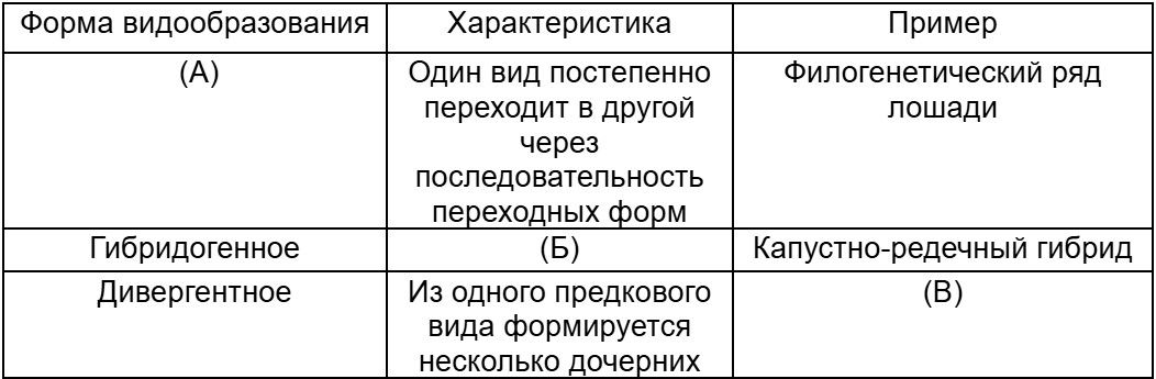 Проанализируйте таблицу «Основные формы видообразования». Для каждой буквы выберите соответствующий элемент из предложенного списка.