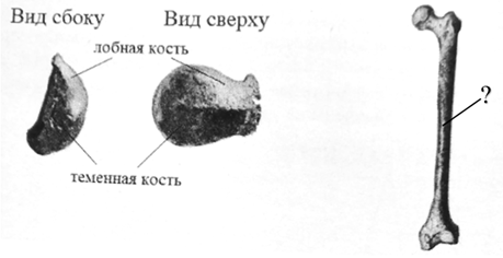 На рисунках изображены кости человека прямоходящего (Homo erectus), обитавшего 800 тыс. лет назад. (А) Какая особенность строения свода черепа отличает его от свода черепа вида современного человека? (Б) Какая кость обозначена вопросительным знаком? (В) По каким морфологическим признакам это можно утверждать? (Г) На территории каких континентов обитали представители вида Человек прямоходящий? Запишите четыре цифры в порядке, соответствующем буквам.