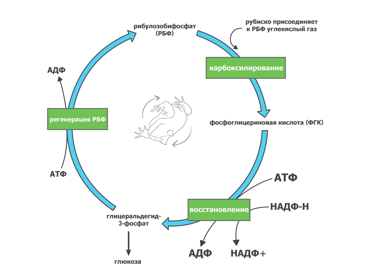 Фермент рибулозобифосфат-карбоксилаза/оксигеназа (рубиско) присоединяет углекислый газ к пятиуглеродному сахару рибулозобифосфату (РБФ). Получается нестойкое 6-углеродное соединение, которое распадается до двух молекул трехуглеродной фосфоглицериновой кислоты (ФГК). ФГК поступает в сложную комплексную реакцию – цикл Кальвина.