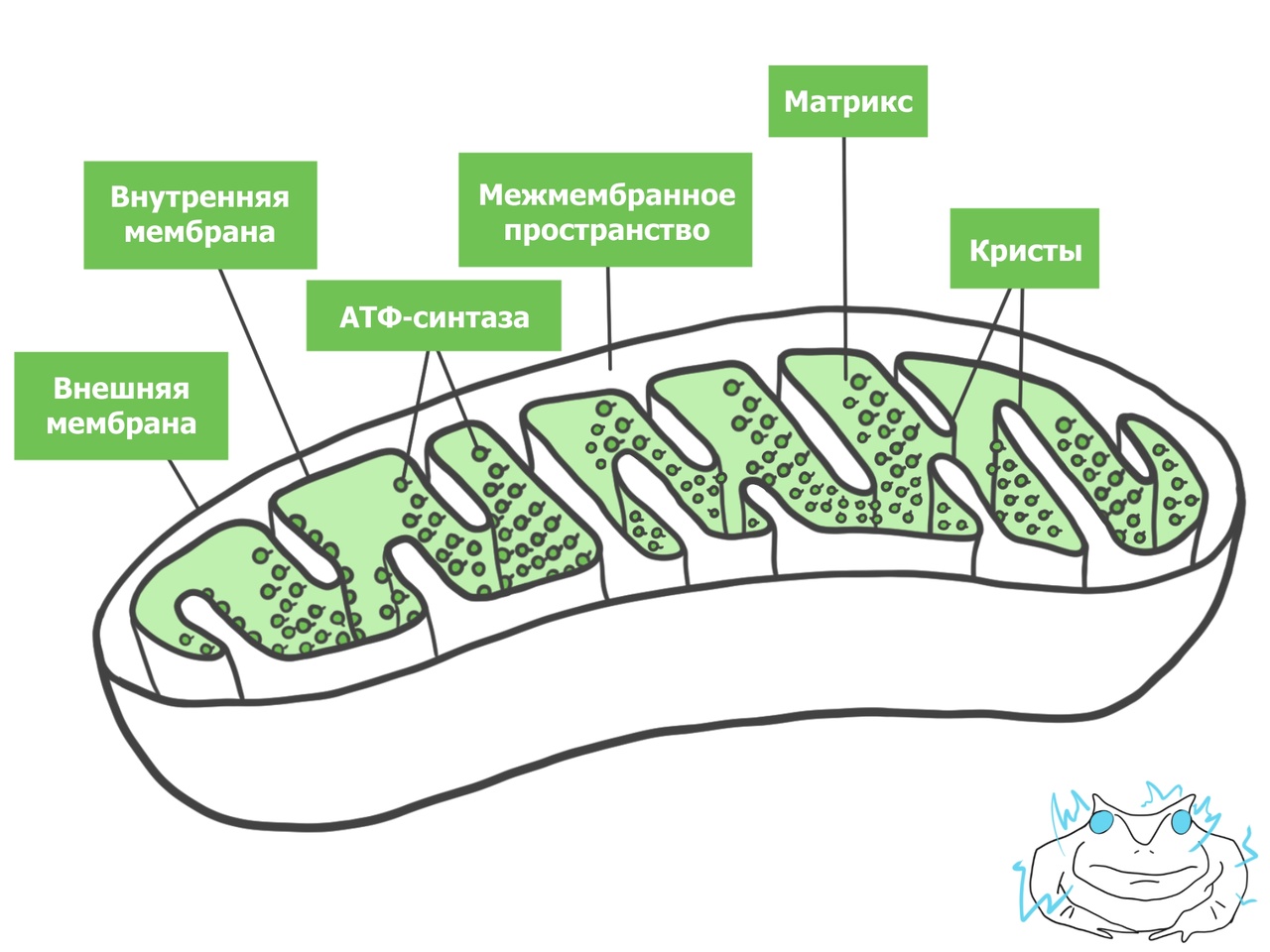 Покрыты двумя мембранами. Наружная мембрана гладкая, внутренняя имеет выросты внутрь – кристы, они увеличивают площадь внутренней мембраны, чтобы расположить на ней как можно больше ферментов клеточного дыхания.