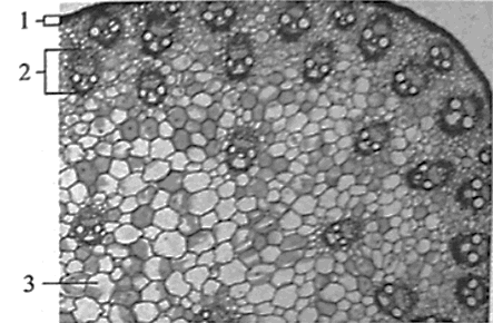 Установите соответствие между характеристиками и структурными элементами стебля, обозначенными цифрами на рисунке. Запишите цифры в порядке, соответствующем буквам. Цифры в ответе могут повторяться.